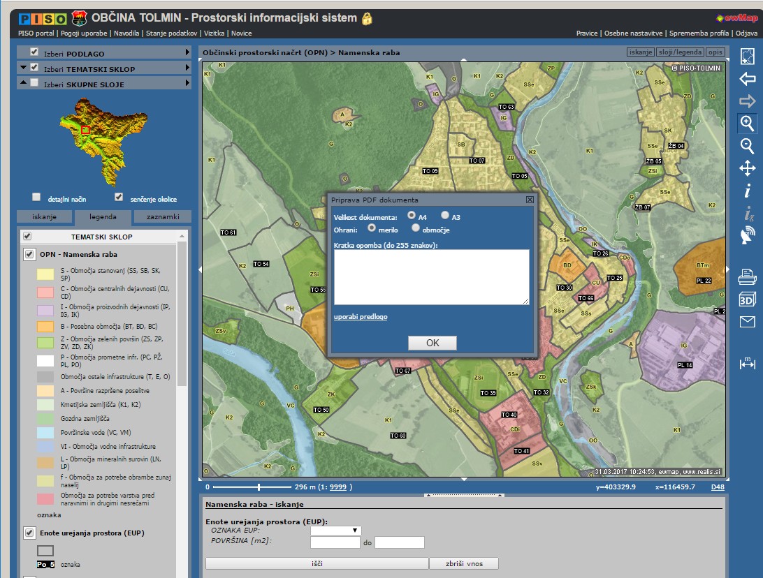 Sistem PISO omogoča pripravo kartografskih podlog za izbrano območje in za želeno vsebino. Pri tem lahko izdelamo georefencirano sliko v zapisu JPG ali PDF dokument.