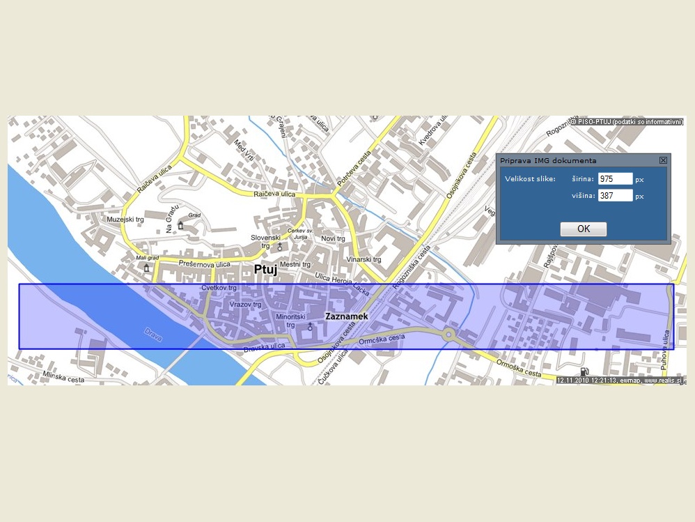 Priprava dokumenta v formatu PDF omogoča izvoz vsebine prikaza vključno z ostalimi elementi karte (naziv, okvir, legenda, merilo ...) Nova možnost "Obdrži trenutno merilo pogleda" ohranja merilo ter vsebino prikaza prilagodi formatu tiskanja (A4 oz A3). Odznačena (izklopljena) možnost pa uporabniku omogoča, da pripravi karto z najmanj celotno vsebino prikaza.