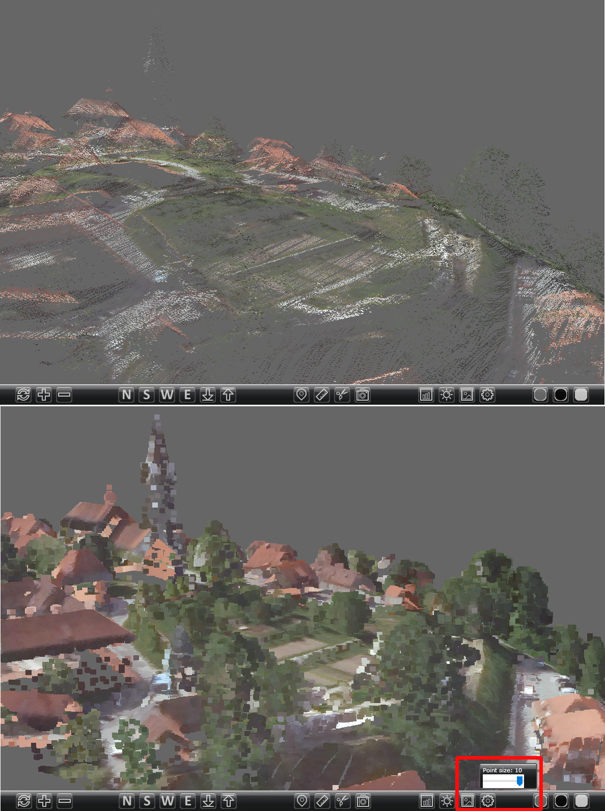 2. NASTAVITEV VELIKOSTI TOČK: Pri pregledovanju oblaka točk lahko spreminjate velikost točk, s čimer dobite bolj polno sliko. Zgornja slika prikazuje avtomatsko velikost točk, pri spodnji pa smo točke povečali. Pri teh dveh slikah se točke barvajo glede na barvno vrednost digitalnih fotografij.