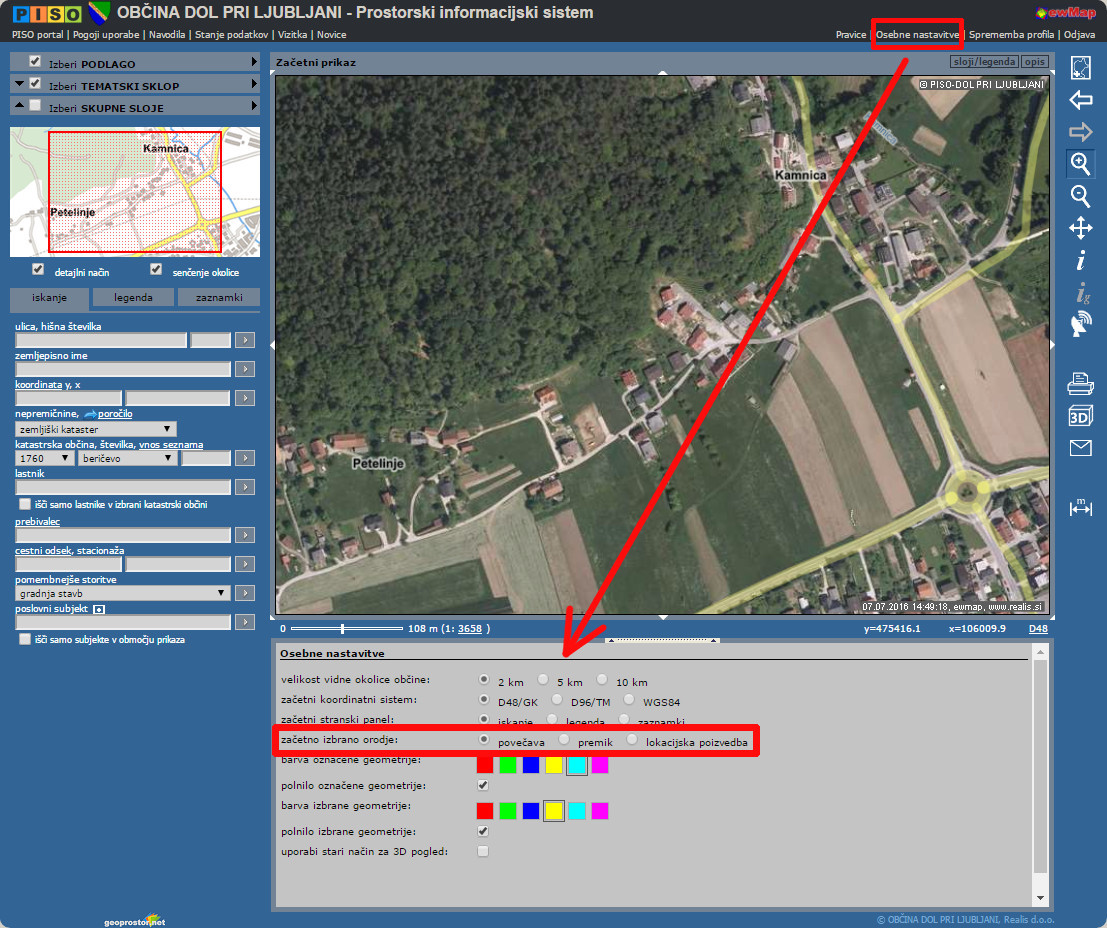 Med osebnimi nastavitvami lahko izberete orodje, ki bo privzeto izbrano ob prijavi v PISO Spletni pregledovalnik. Med možnostmi začetnega izbranega orodja so povečava, premik in lokacijska poizvedba.