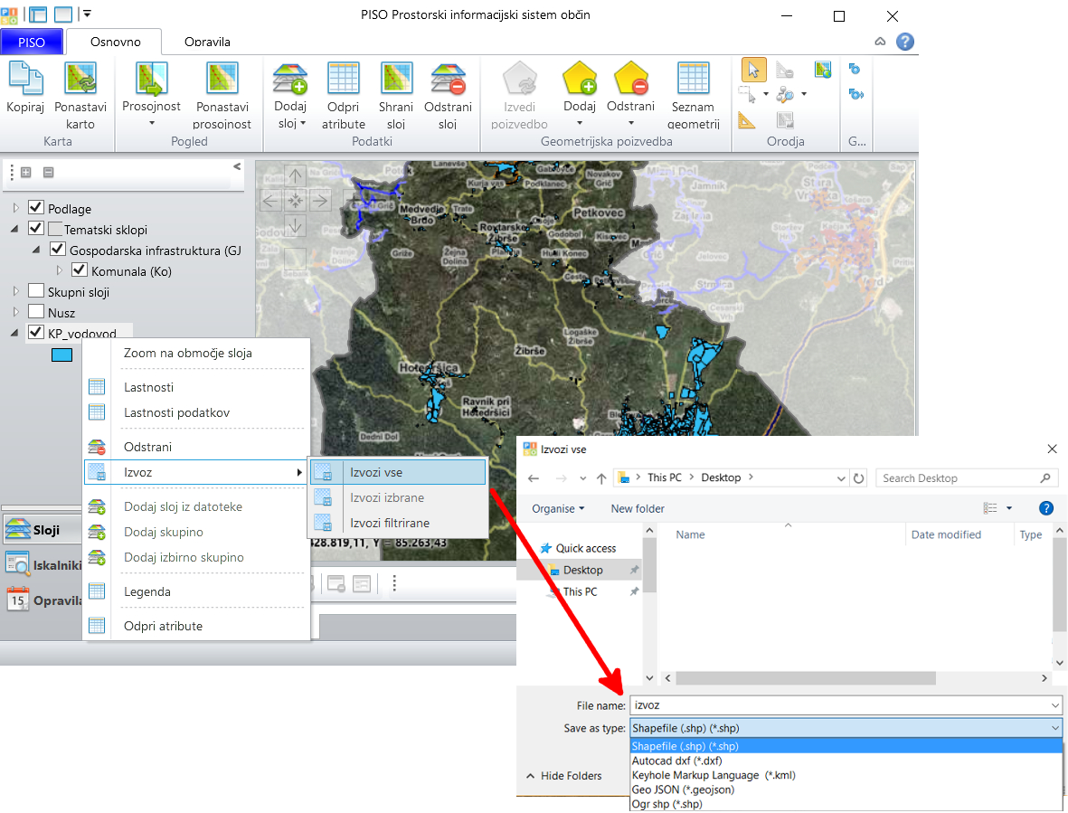 V namizni aplikaciji PISO Desktop je omogočen enostaven izvoz poljubnega sloja v vse standardne formate: