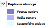 PRIKAZANI SLOJI: Zelo redke (katastrofalne) poplave - povratna doba Q50 in več, Redke poplave - povratna doba Q10 do Q20, Pogoste poplave - povratna doba Q2 do Q5. Vir podatkov: MOP - Agencija RS za okolje.