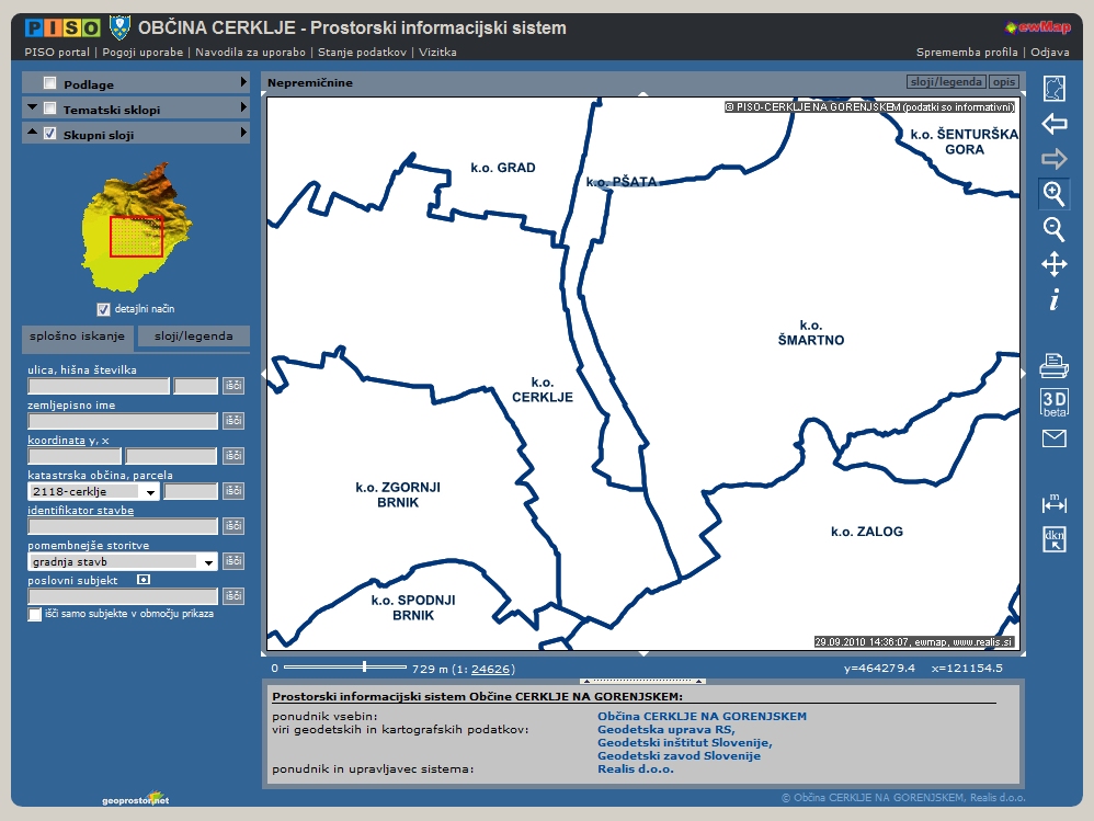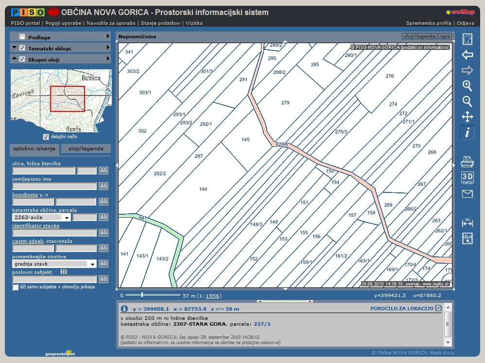 - iskanje po parcelnih številkah v okviru katastrskih občin